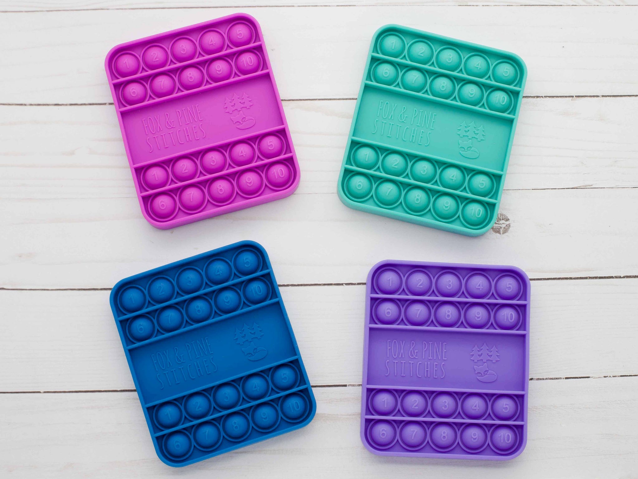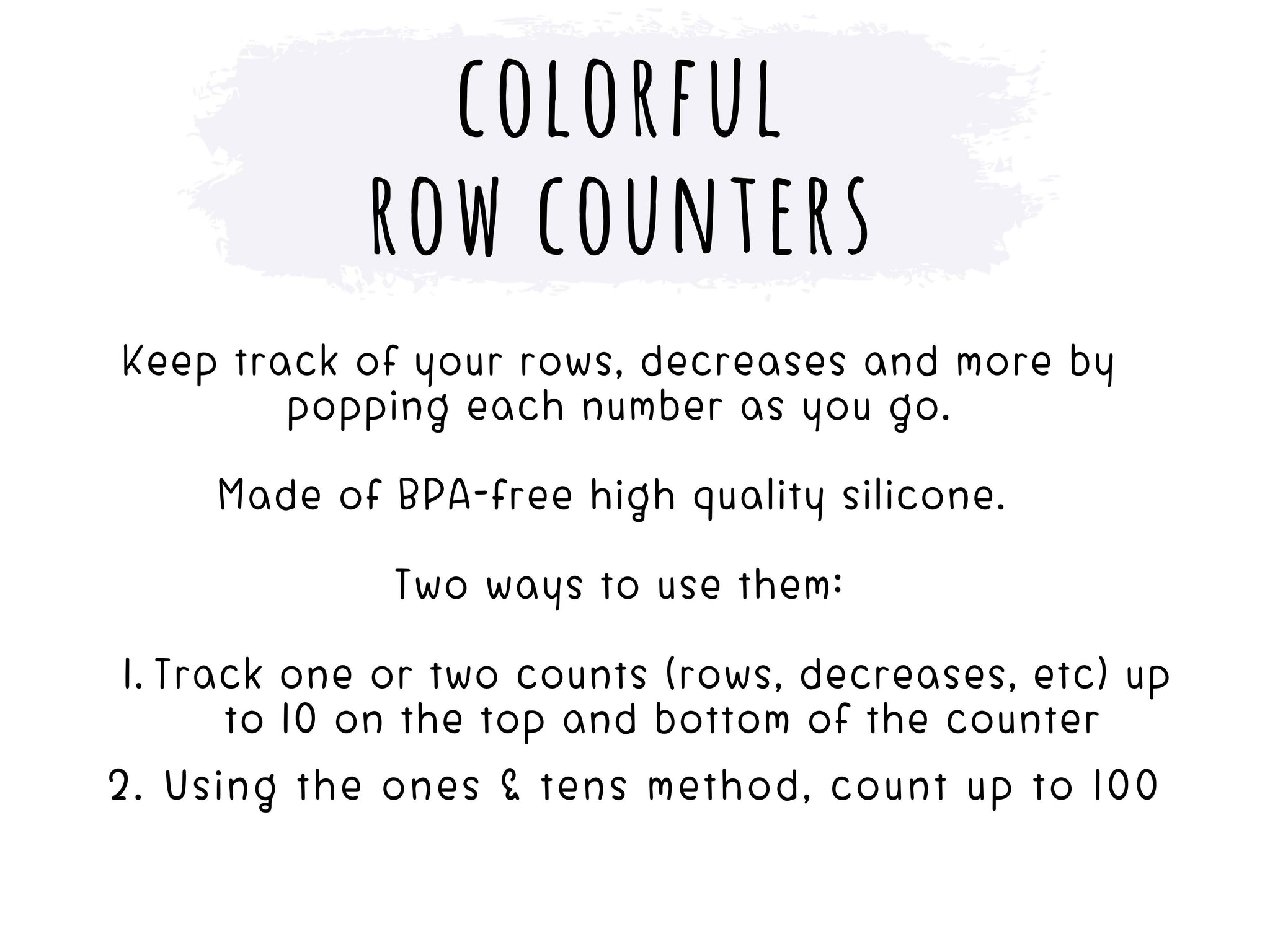 Introducing our new Fox & Pine Stitches Colorful Row Counters! Keep track of your rows, decreases, increases, color changes and more by popping each number as you go. Made of BPA-free high quality silicone. Two ways to use them: Track one or two counts (rows, decreases, etc) up to 10 on the top and bottom of the counter. Also count up to 100 using the ones & tens method. They are available in our 4 staple colors that coordinate with our Notion Nooks, Yarn Belts, Colorful Pouches, Cable Needles and more! This listing is for one counter.