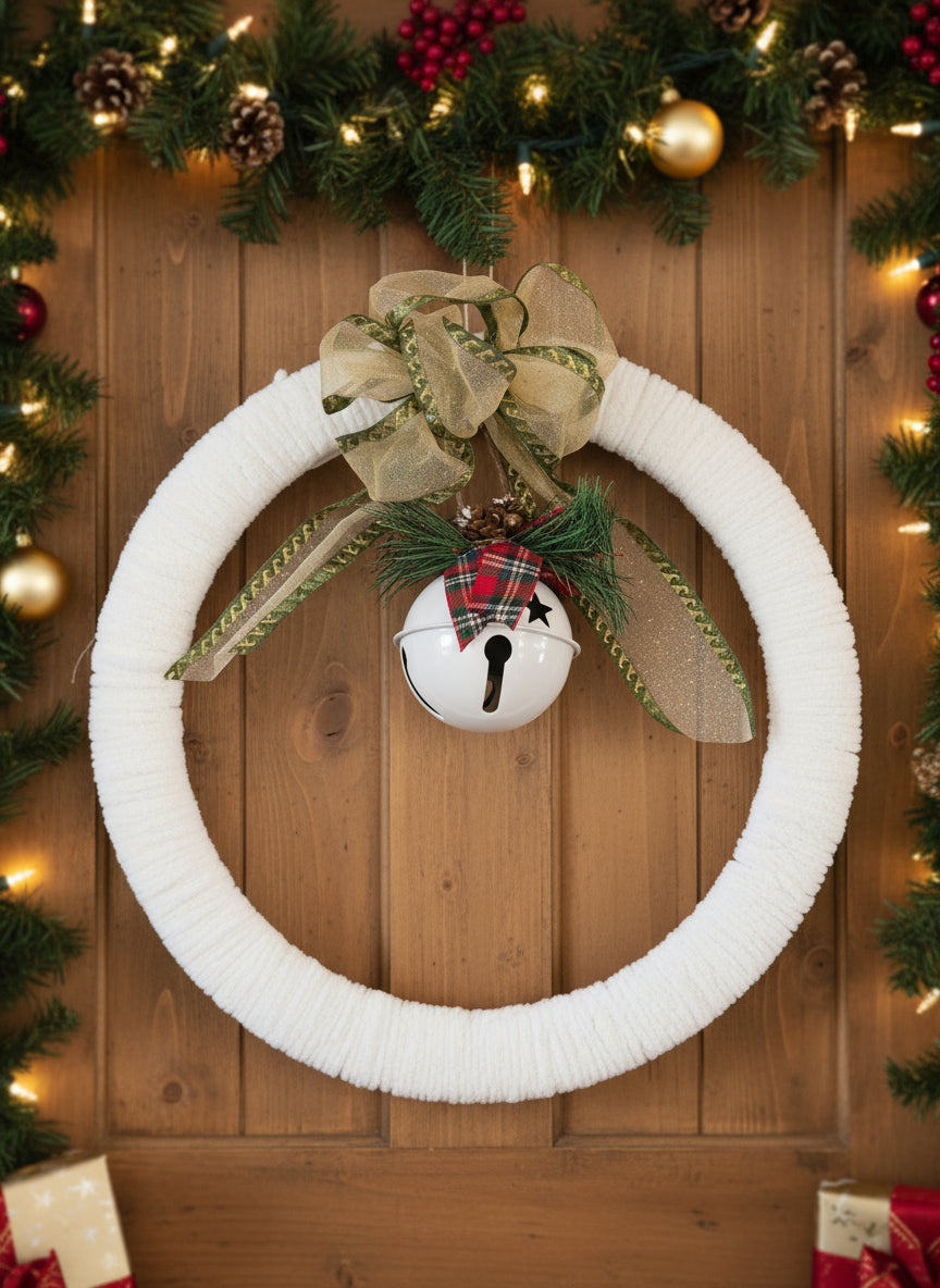 15. Cream Yarn wreath with Christmas ornament & ribbon 15" diameter