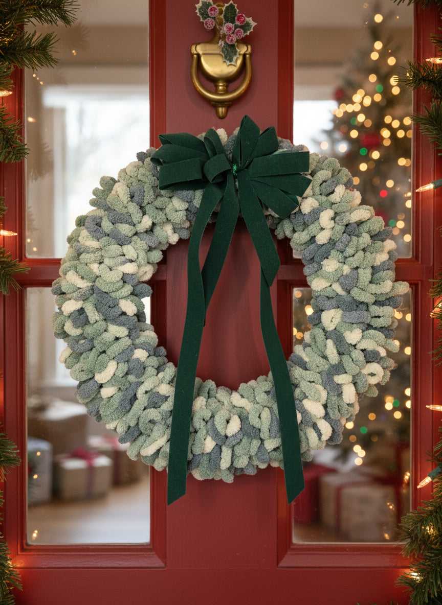 14. Green Loop Yarn wreath with green ribbon 15" diameter