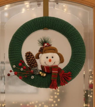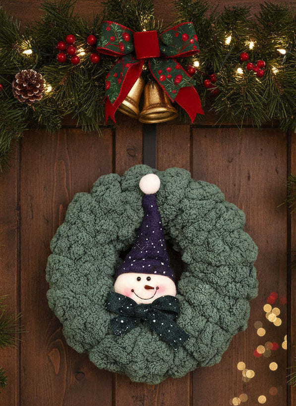 12. Green yarn wreath with snowman head and greenery. 15" diameter